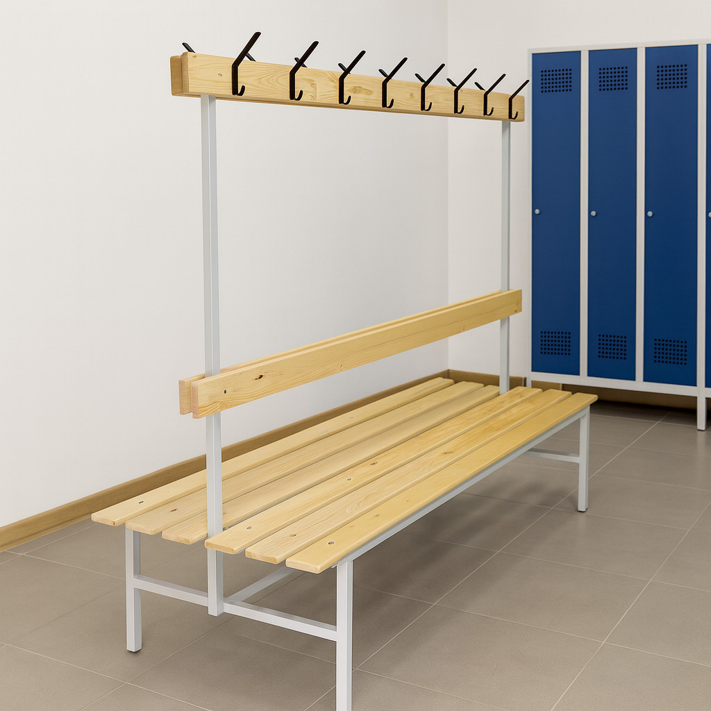 - Šatní lavice oboustranná s opěrkou a věšáky o délce 2000 mm.