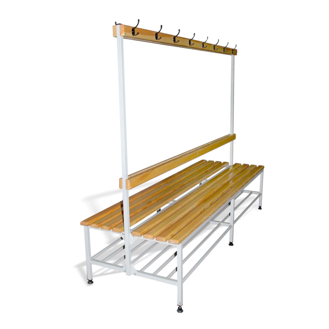Oboustranná šatní lavice s opěrkou a věšáky o délce 2000 mm s roštem na obuv