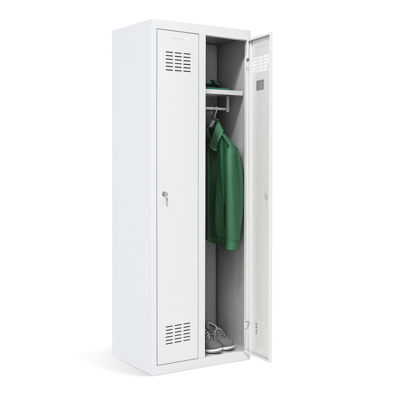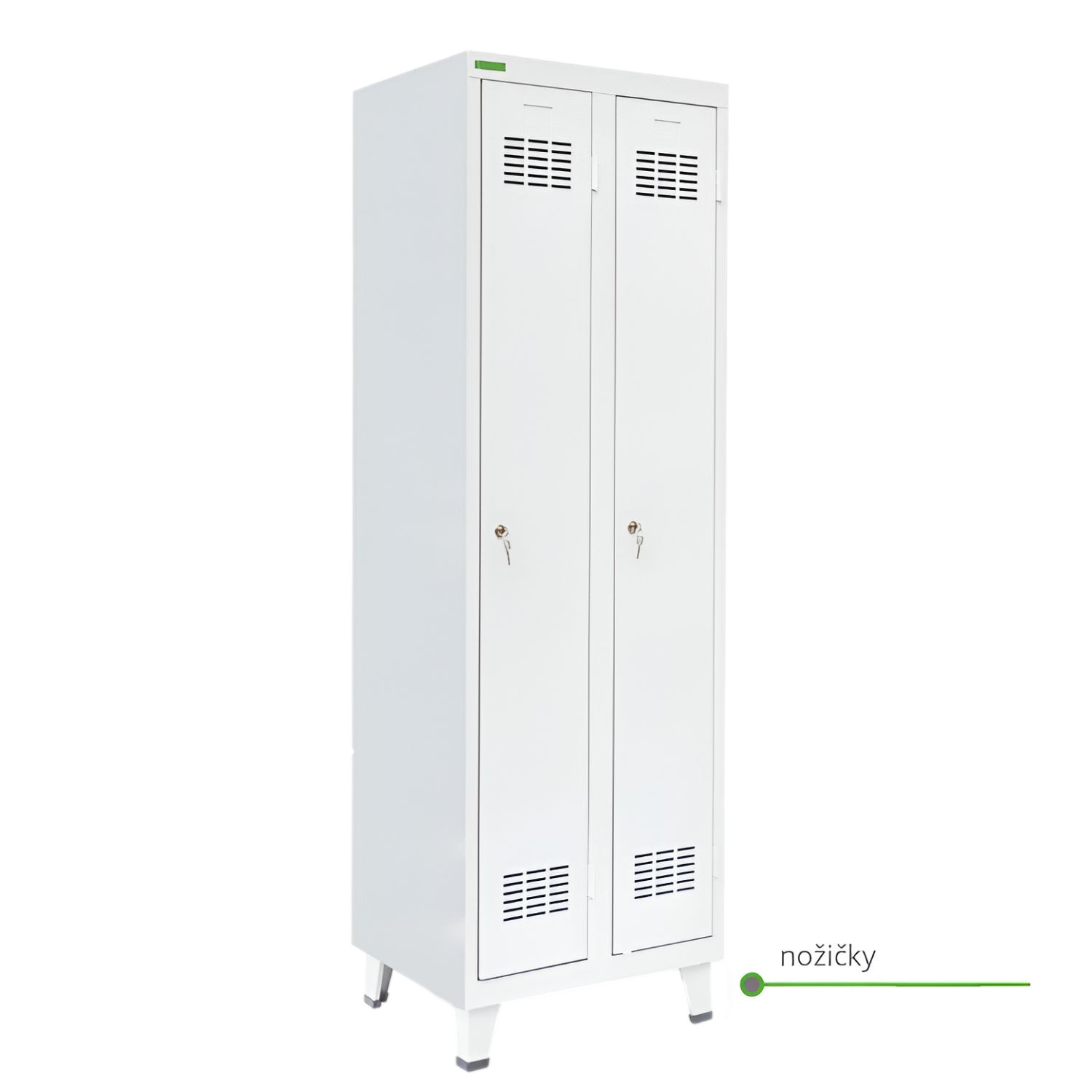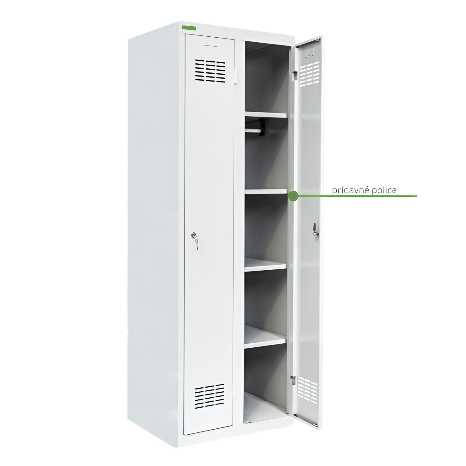 - Základní výbava: odkládací police, tyč na ramínka, držák na ručník, zrcadlo, háčky na věšení šatů, nízký sokl pro více místa ve skříni, větrací otvory v horní a dolní částí dveří, bezpečnostní zámek (s 2 klíči)