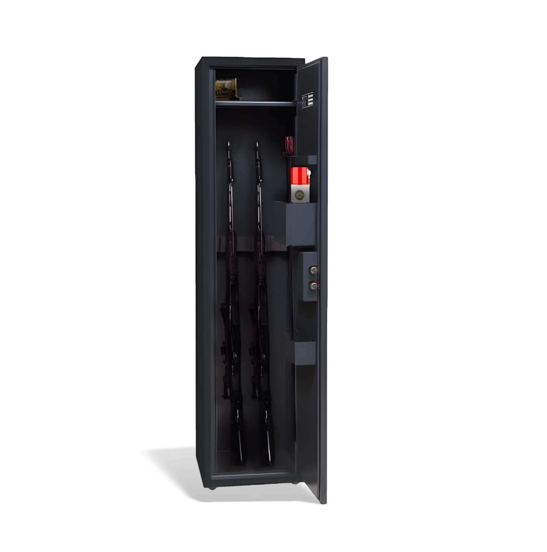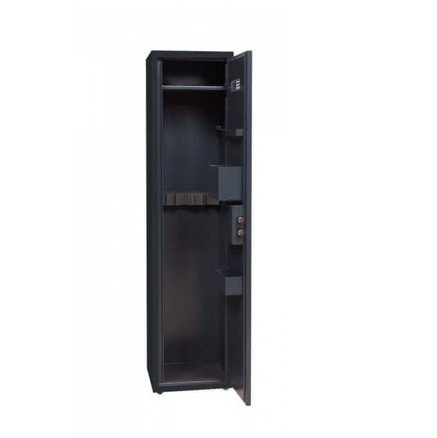 Skříňka je uzamykatelná na klíč a umožňuje bezpečné uložení 3 zbraní o maximální délce 1060 mm. Součástí skříňky je vnitřní police, která je stejně hluboká jako samotná skříňka, a praktické doplňkové vybavení na dveřích: držáky na střelivo, doklady, zásobníky, balistol (sprej), dalekohled nebo jiné příslušenství. Skříňka je k dispozici v elegantní antracitové barvě (RAL 7016) s vnitřnímobjemem 68 litrů. Tloušťka dvířek je 2,4 mm a ve spodní části skříňky je houbová vložka, která zabraňuje sklouznutí zbraní.
