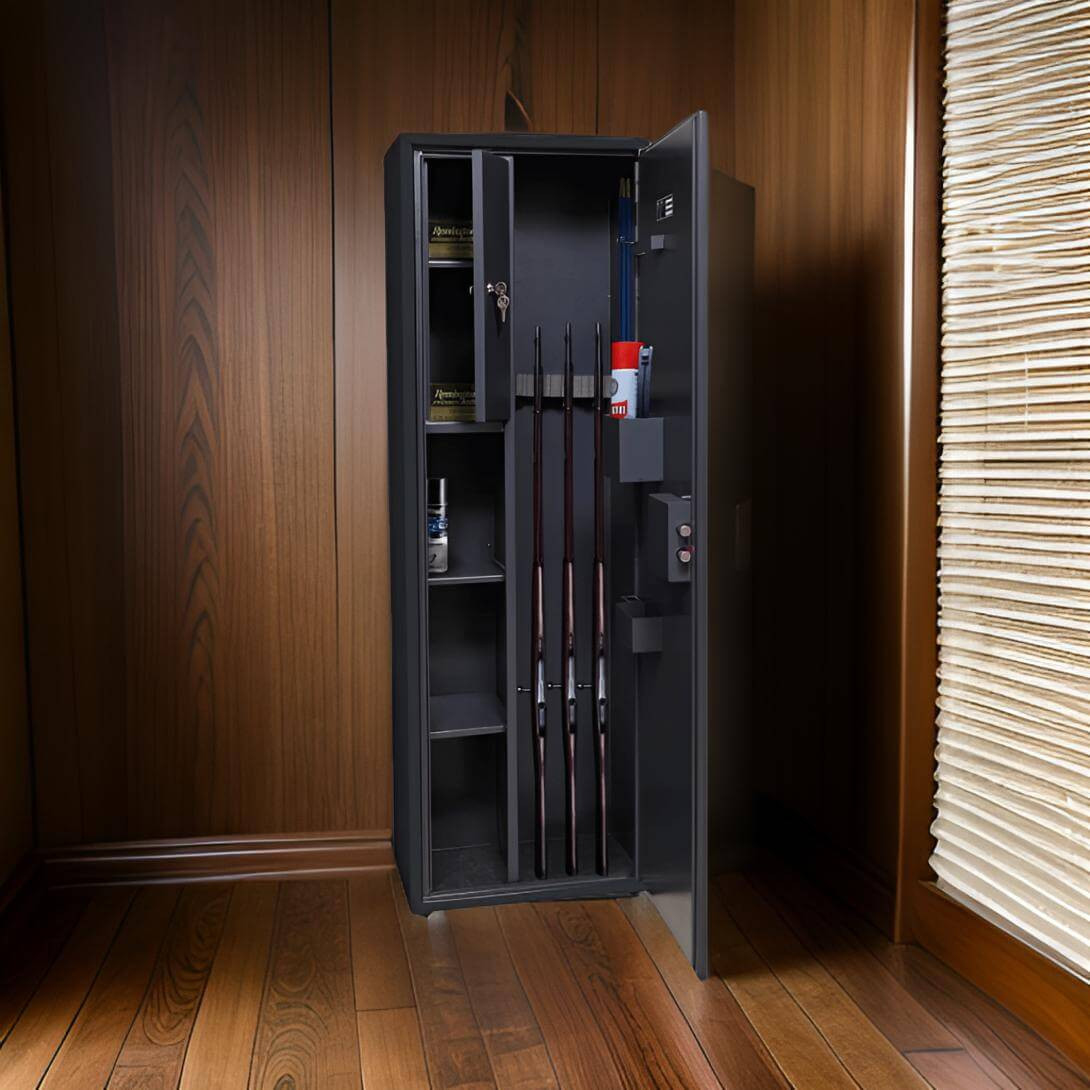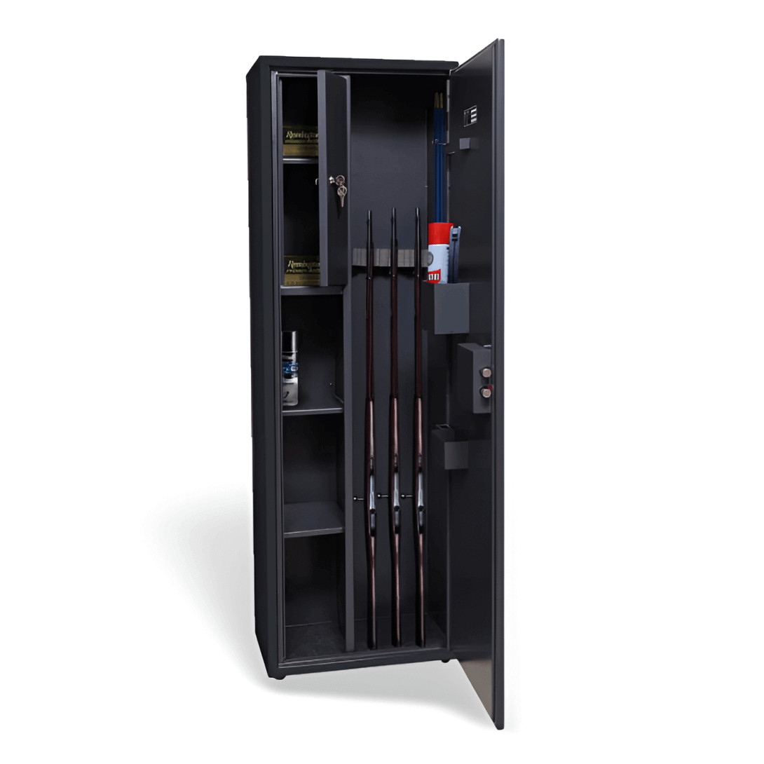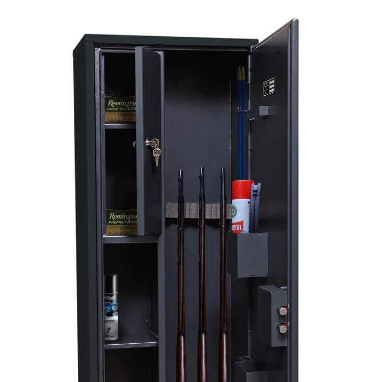 Tato skříň umožňuje bezpečně uložit 4 zbraně o maximální délce 1260 mm, uzamčené zámkem na klíč.Skříň obsahuje 2 vnitřní police, uzamykatelnou skříňku s policí a praktické doplňkové vybavení na dveřích: držáky na střelivo, doklady, zásobníky, balistol (sprej), dalekohled nebo jiné příslušenství.