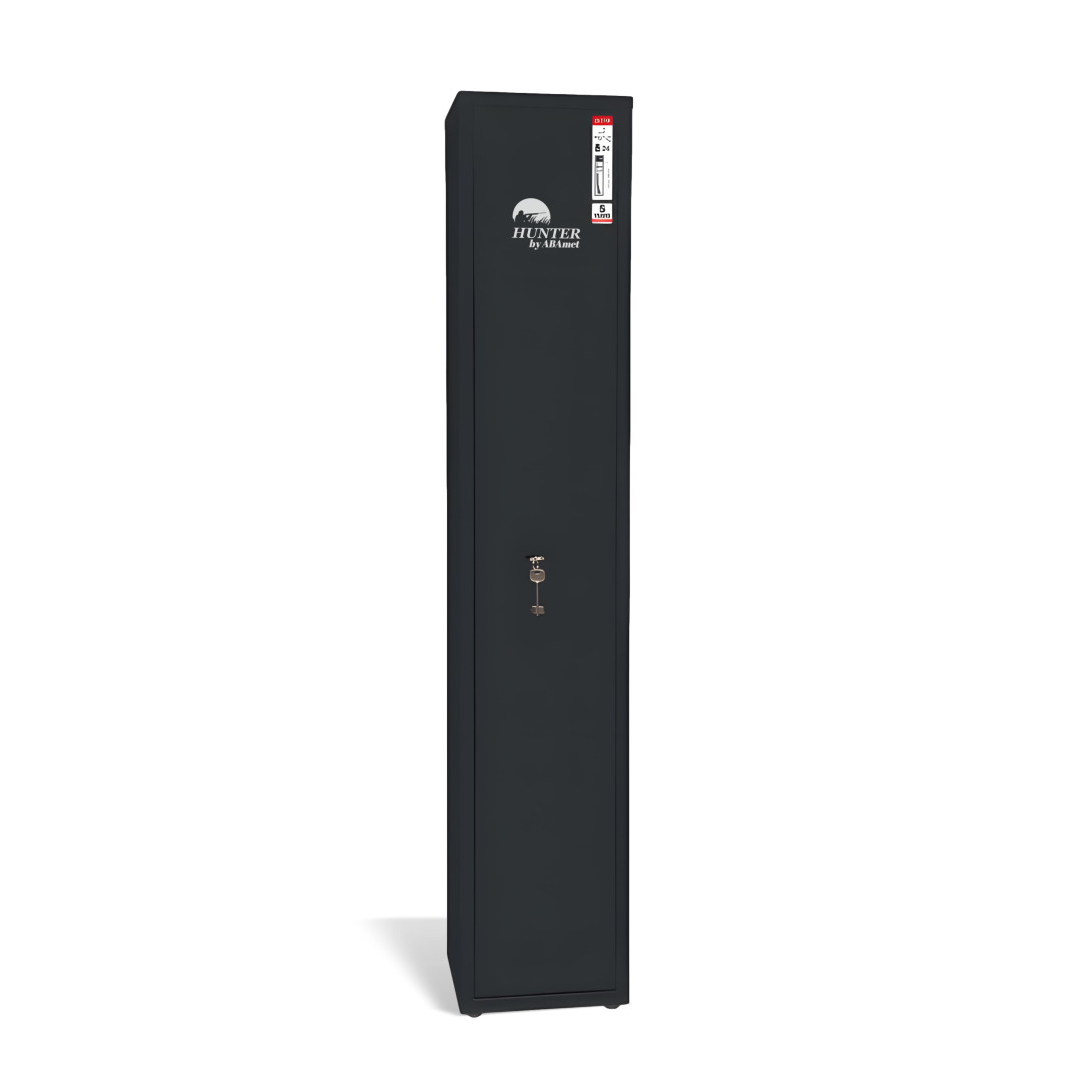 Uvnitř této skříně najdete uzamykatelnou skříňku s policí adržáky dveří. Do tohoto trezoru se vejdou 4 zbraně s maximální délkou pušky 1260 mm. Uzamknete jej zámkem na klíč.