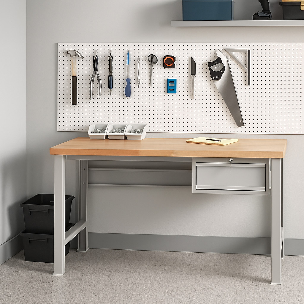 Tento pracovní stůl kombinuje odolnou konstrukci, kvalitní desku a praktický úložný prostor – ideální volba pro řemeslníky i domácí kutily.