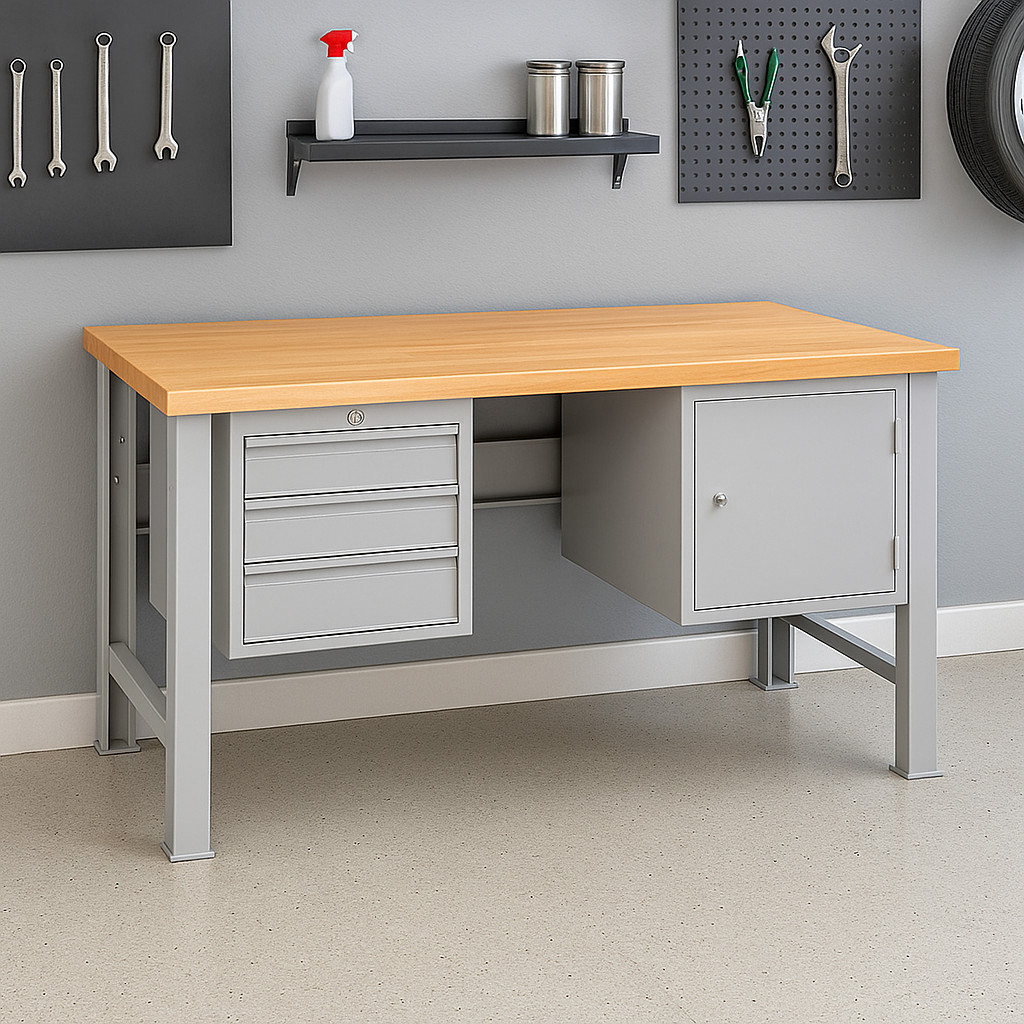 Kompaktní, pevný a spolehlivý – tento pracovní stůl s bukovou deskou o délce 1500 mm a tloušťce 40 mm je ideální volbou pro dílny, garáže i profesionální provozy, kde je nutná odolnost a stabilita. Ocelové nohy z plechu o tloušťce 2,5–3,0 mm v kombinaci s masivní deskou zaručují nosnost až 500 kg, takže stůl bez problémů zvládne i náročné pracovní podmínky.