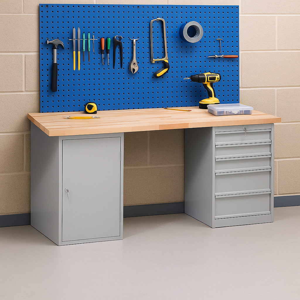 Tento pracovní stůl spolehlivě spojuje pevnost, funkčnost a přehlednost – skvělá volba pro řemeslníky, techniky i údržbáře.