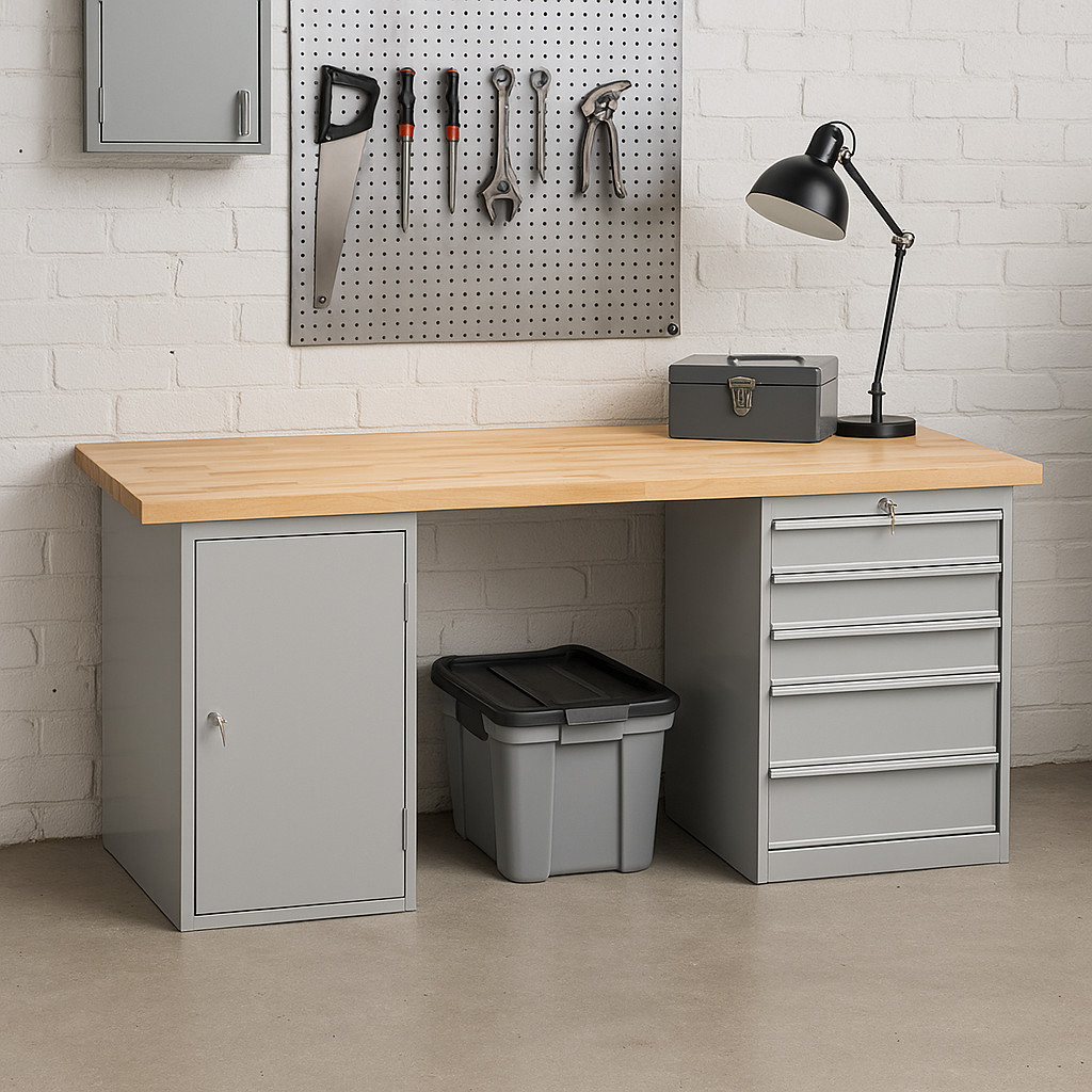 Stůl s nosností až 500 kg je vybaven 5-zásuvkovou skříňkou a 1-dveřovou skříňkou se dvěma policemi, které jsou vyrobeny z ocelového plechu tloušťky 0,7–0,8 mm. Každá zásuvka má nosnost 40 kg, plný 100% výsuv na kuličkových ložiskách a uzamykání pomocí cylindrického zámku, což umožňuje bezpečné a přehledné uložení nářadí či drobného materiálu. Skříňka s policemi poskytuje praktický prostor i pro větší předměty.