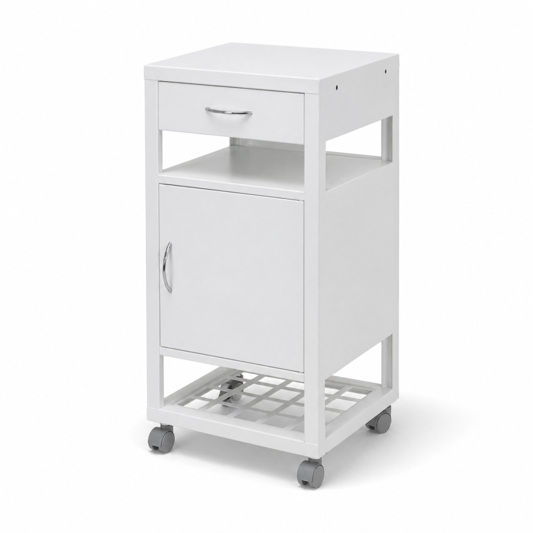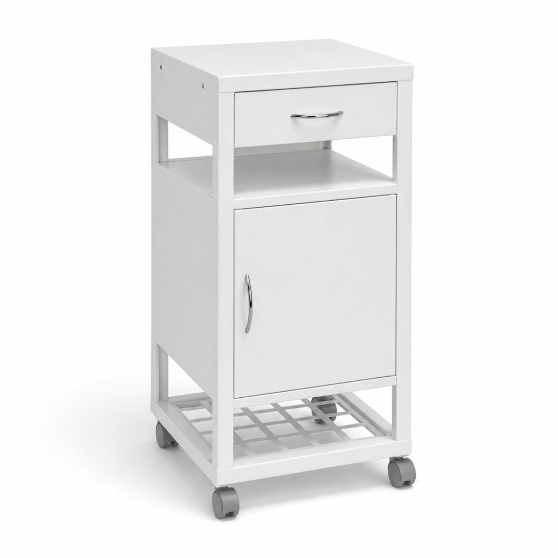 Pojízdný kovový noční stolek BEDSIDE CAB H WE v elegantní bílé barvě (RAL 9010) je praktickým řešením pro nemocnice, domovy důchodců, zdravotnická a ošetřovatelská zařízení. Spolehlivá kovová konstrukce a kvalitní povrchová úprava práškovým lakem zaručují dlouhou životnost, odolnost a snadnou údržbu.