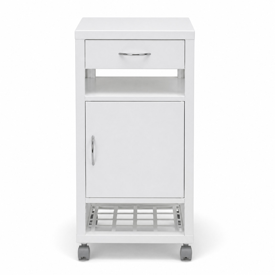 Úložný prostor je přehledně rozdělen – obsahuje jednu zásuvku, skříňku s dvířky a otevřenou odkládací plochu. Pro větší pohodlí je součástí vybavení také držák na ručník a pevné úchyty, které usnadňují přesouvání a používání stolku v každodenním provozu.