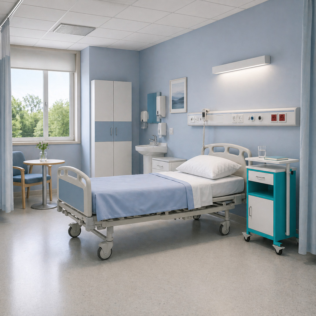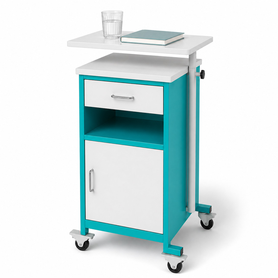 Nemocniční noční stolek s otočnou jídelní deskou představuje praktické řešení pro zdravotnická zařízení, kde je důležitý komfort pacienta i efektivní manipulace personálu. Díky promyšlené konstrukci umožňuje snadné používání přímo u lůžka.